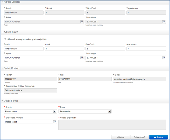 Datele din secțiunile Detalii Entitate Economică, Adresă Juridică, Adresă Fizică, Detalii Contact sunt precompletate pe baza informațiilor existente în RDA. Datele din aceste secțiuni se actualizează în formular daca se introduce un alt IDNP/IDNO în secțiunea Detalii Entitate Economică.